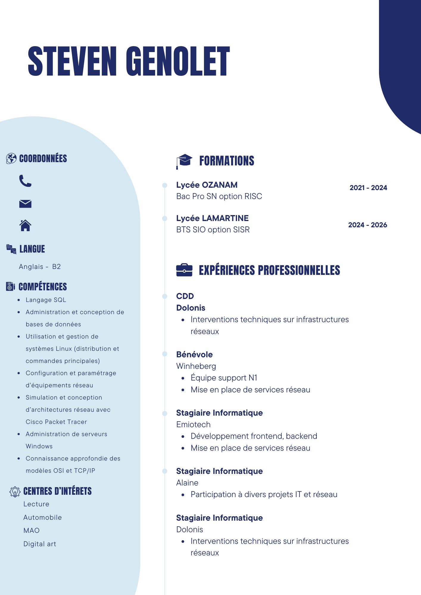 Après un bac pro SN option RISC, je poursuis un BTS SIO option SISR pour me spécialiser dans l’administration des systèmes et réseaux. Mes études et expériences pratiques m’ont permis de développer des compétences en gestion d’infrastructures, configuration d’équipements réseau, virtualisation et sécurisation des systèmes. Mon objectif est de devenir administrateur réseau dans une entreprise ou organisation, en garantissant la performance et la sécurité des infrastructures informatiques. À terme, je souhaite me spécialiser davantage en obtenant des certifications reconnues (CCNA, AWS, etc.).